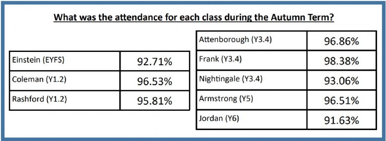 The table below shows the number of children per class that had 100% attendance for the second half of the autumn term.