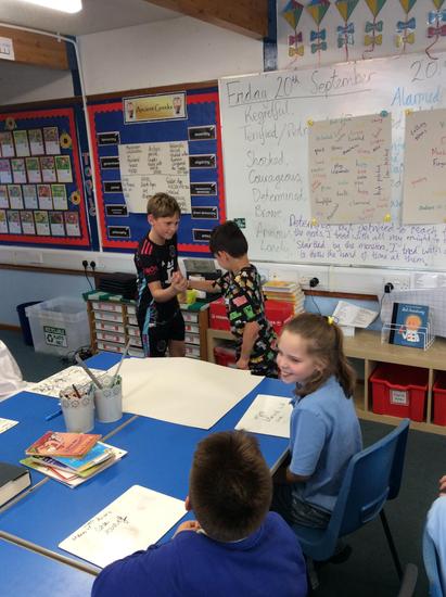 During English this week, the children inferred how the character in our text felt and acted. Once they had identified how Arthur was feeling and acting, they wrote some fantastic outside, inside sentences (which is very tricky!) For example: 'As my whole body shook with terror, I crouched down to avoid the immense tentacles which had immerged from the water. Never in my life had I been so lonely and frightened. We then used what we had learnt so far in the unit to shared write some of the story. The children used fantastic figurative language to describe the setting as well as expanded adjective clauses to start their sentences when writing about the problem section. Next week, they will innovate and write their own!