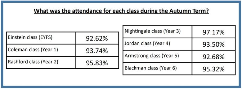 This table shows the number of children per class that achieved 100% attendance for the first half of the Autumn Term. All of these children have been awarded 5 Dojo points!