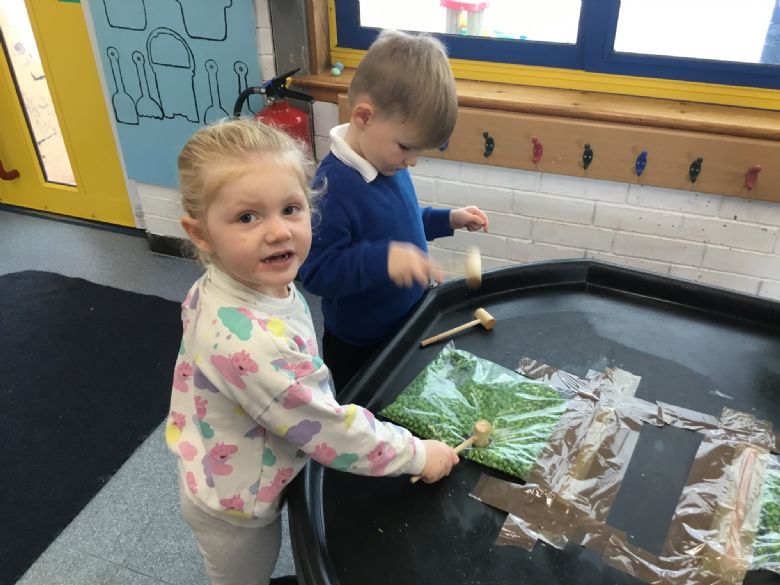 โ๏ธ In our sensory play, we explored frozen peas using scoops, bowls, and hammers! The children investigated how the peas changed as they melted and loved experimenting with textures and temperatures.