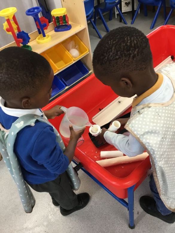 In the water tray, the children explored sinking and floating. Working together, they discovered that ping pong balls float in the jugs of water, while gems and stones sink to the bottom. "They are heavier," one child commented — a brilliant early science observation! π§βοΈπ§ͺ