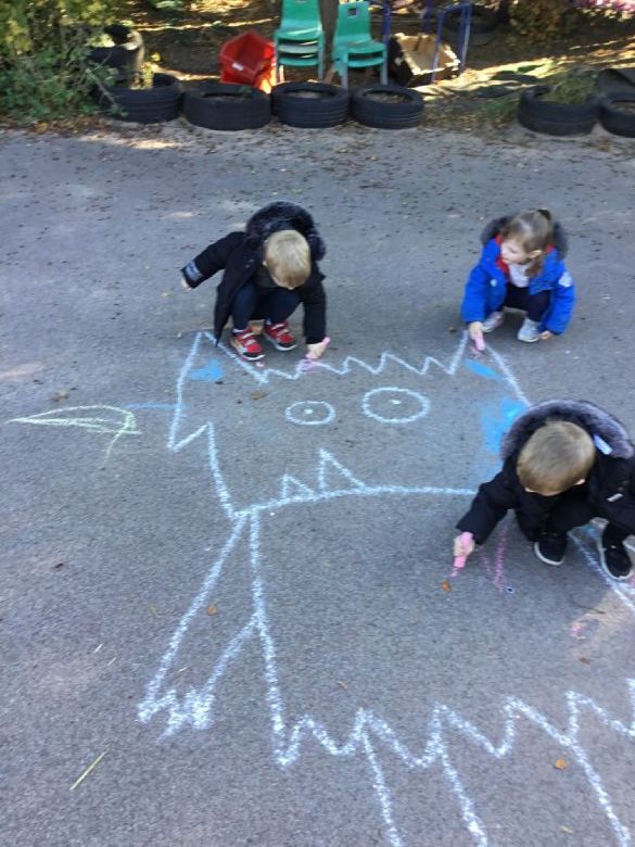 ๐จ Outside, the children loved chalking with lots of different colours, helping to develop their gross motor skills and bilateral movements. In playdough, they created faces using autumn treasures – a brilliant way to build finger strength while also talking about features of their face . ๐